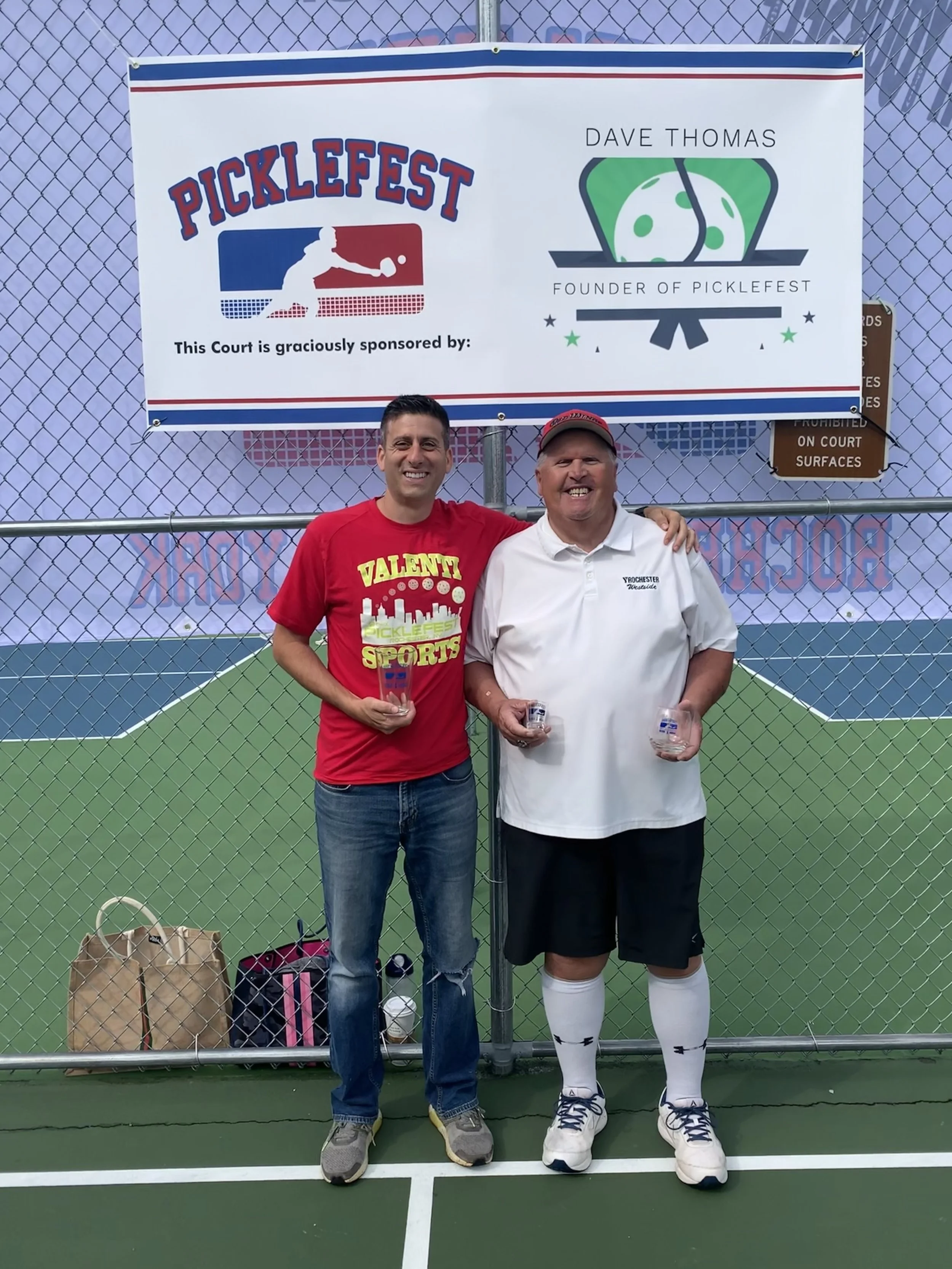 Dave Thomas was contacted by Scott Bell, Director of the Monroe County Sports Commission, who was looking to introduce pickleball to the county’s annual Sports & Music Festival at Ontario Beach Park. The original plan was to clear a section of the parking lot near Bill Gray’s for makeshift courts. Dave offered to rally a crew of westside YMCA players to line the courts, and Scott agreed to provide portable nets.