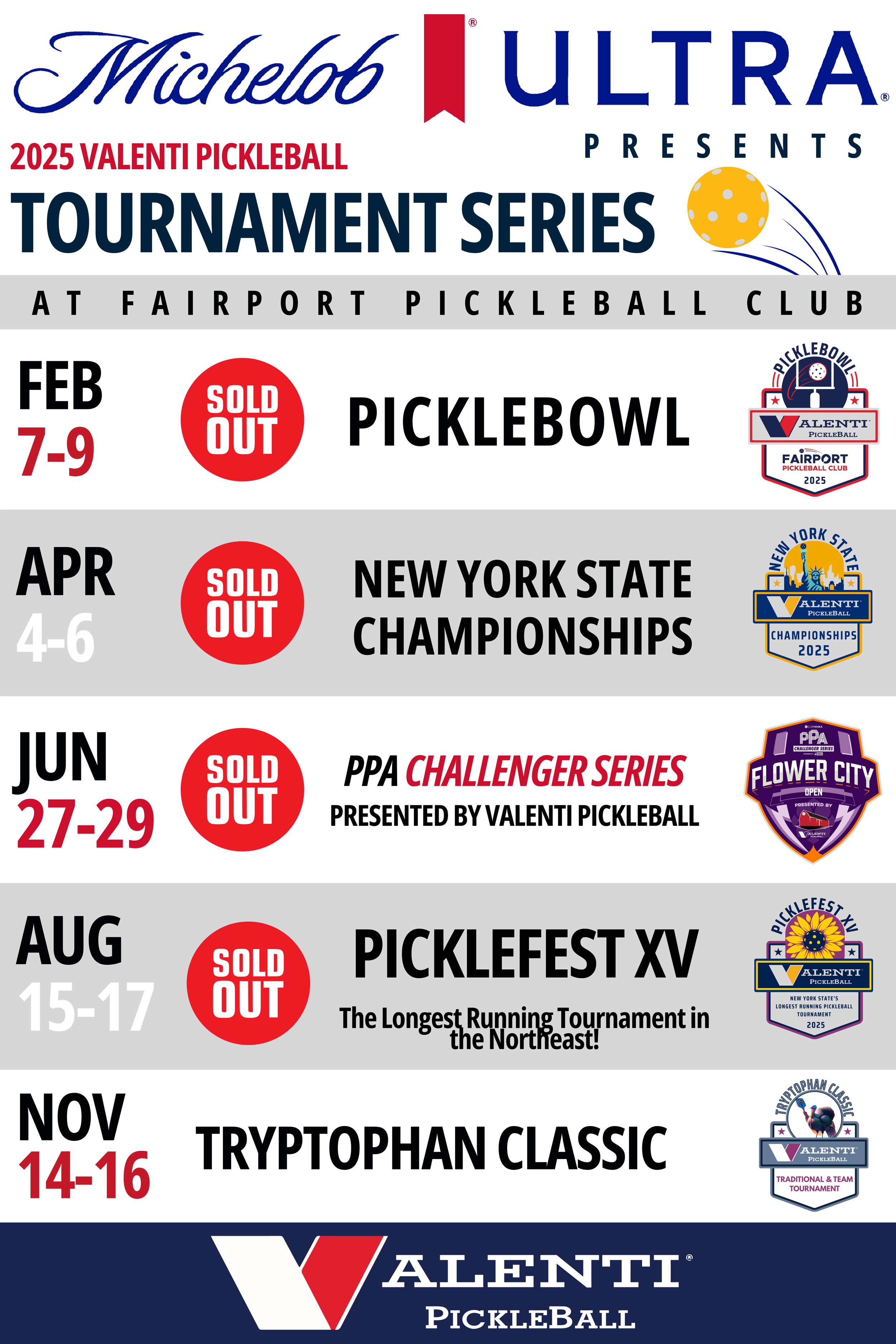 Join us for Valenti Pickleball’s Daylight Savings Wooden Paddle Tournament — a fun and competitive doubles event on November 2, 2025 at Fairport Pickleball Club! Your $90 entry includes a wooden paddle, T-shirt, and five guaranteed games in this 32-team round robin showdown.